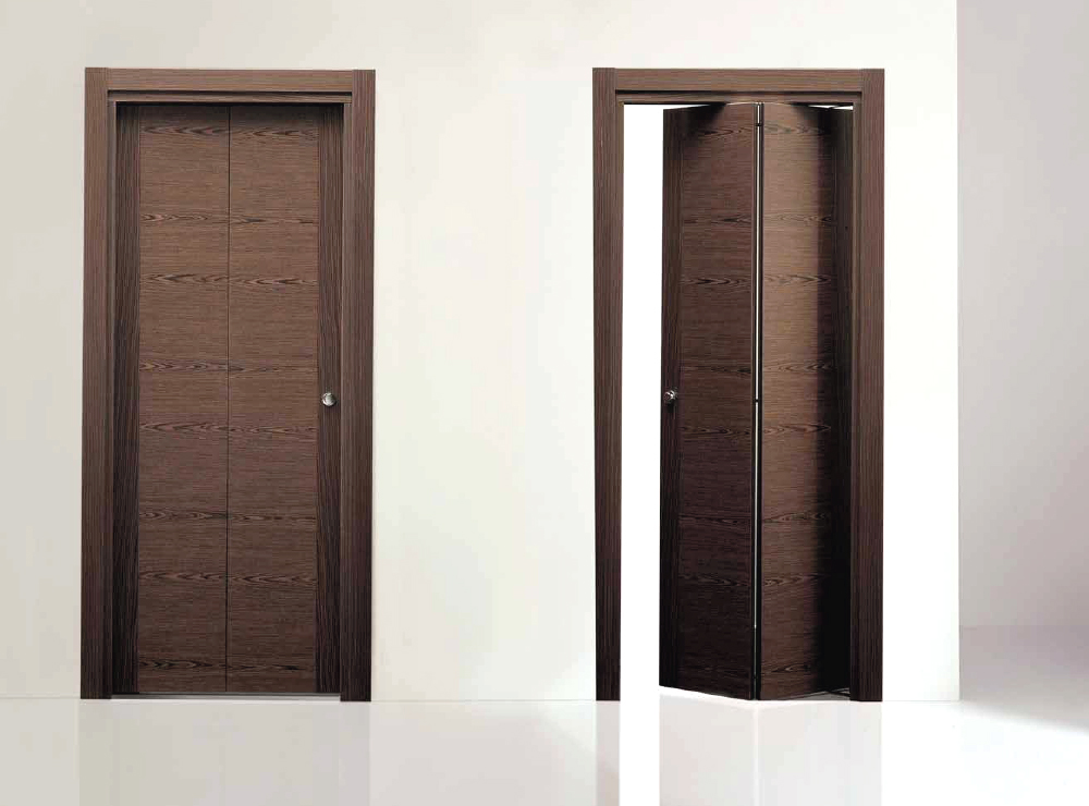 Свежий взгляд на возможности традиционного материала продемонстрировали деревянные двери-книжки. Стильные, компактные, функциональные, они успешно конкурируют с распашными и откатными системами в оформлении «проблемных» участков жилого и рабочего пространства. Особенностью конструкций такого типа является двухкомпонентное полотно, разделённое на равные по ширине или разделённые в пропорции 1:2 сегменты.