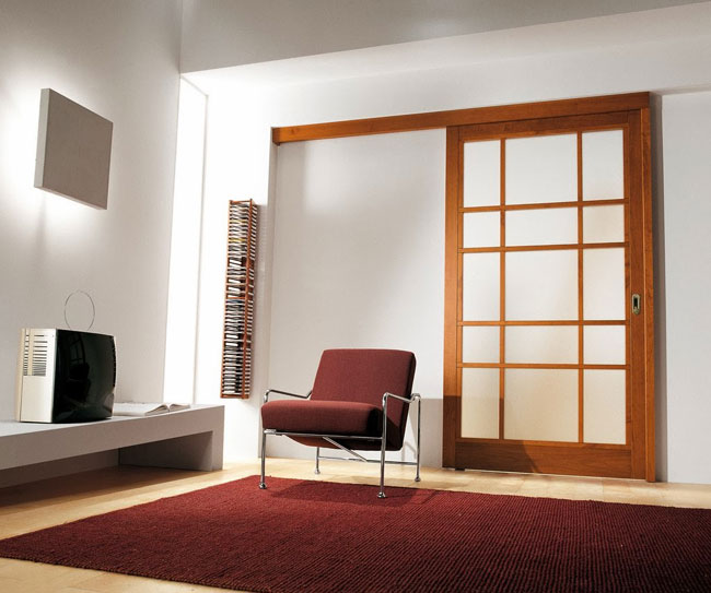 - в ультрамодных квартирах и офисах, выполненных в духе минимализма или хай-тека. Современная деревянная дверь-купе отличается предельно немногословным оформлением. Её основным украшением является фактура и оттенок материала. На рельефных поверхностях контрастно звучат гладкие стёкла и серебристые молдинги.