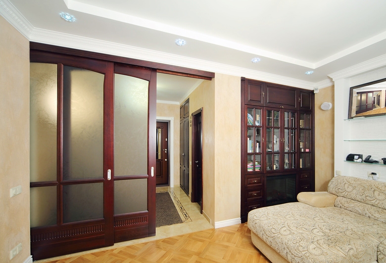 - в помещениях, подчинённых «английскому» стилю с его респектабельным, несколько сдержанным очарованием. Полотна ореховых или дубовых оттенков, дополненные решётчатым остеклением, строгими прямоугольными филёнками, идеально вольются в атмосферу кабинетов и библиотек;