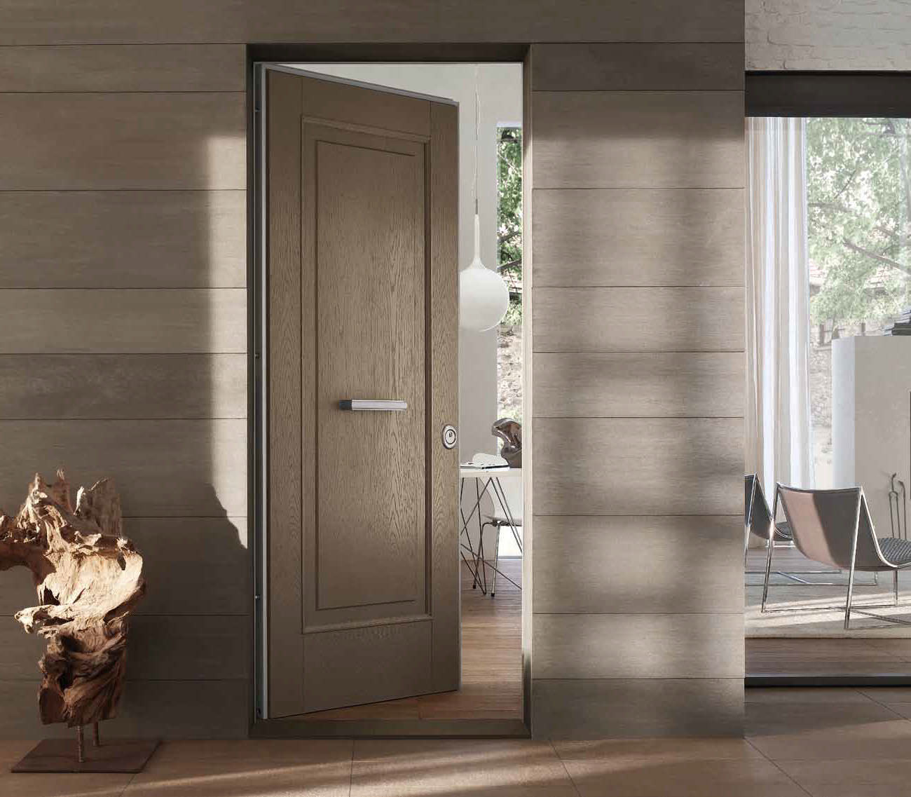 В комплекте деревянных дверей кассетного типа находится металлический пенал, встраиваемый в стену. Поворотная система требует применения специального роторного механизма и т. д.