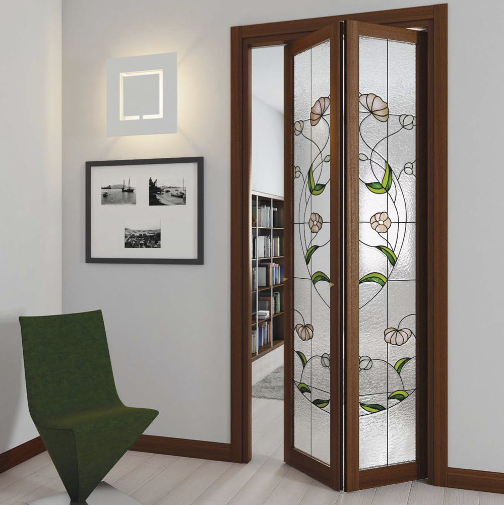 - выбирая подходящие двери-книжка со стеклом для гардеробных и кладовок, хозяева останавливаются на вариантах, которые скрывают обзор. Добиться непрозрачности продукции помогают различные техники обработки - матирование, окрашивание, фотопечать. Примечательной деталью интерьера станет решение, дополненное изысканным витражом или ручной росписью;
