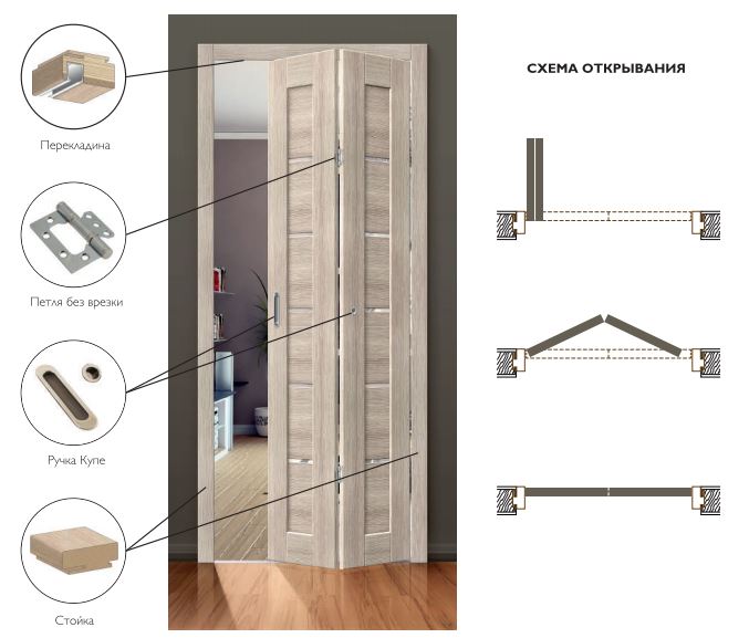 • купить дверь-книжку в комплекте - значит, получить именно ту фурнитуру, которая соответствует техническим и эстетическим особенностям конкретного продукта;