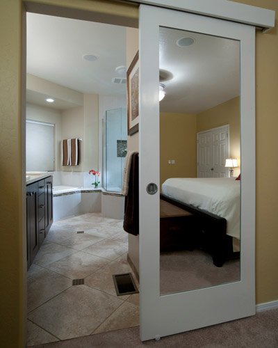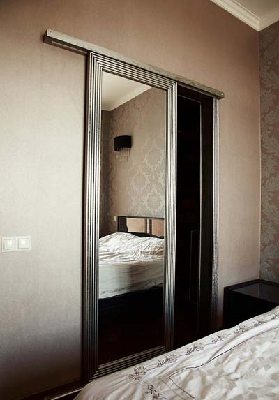 • в малогабаритных комнатах, по ограниченности которых наносится «двойной удар». Во-первых, откатной механизм обеспечивает скольжение створок вдоль стены. При работе они не воруют полезные квадратные метры и не перегружают помещение. Во-вторых, зеркальная поверхность делает комнату более глубокой и просторной. Идея купить раздвижную межкомнатную дверь-купе с зеркалом для маленькой спальни, ванной, кухни наверняка станет удачной;