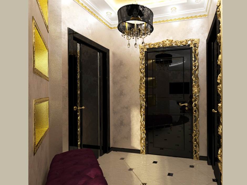 • с различными декоративными элементами под золото - багетами, которые обрамляют филёнки, узорами на дереве или стекле, коваными деталями, позолоченными карнизами;