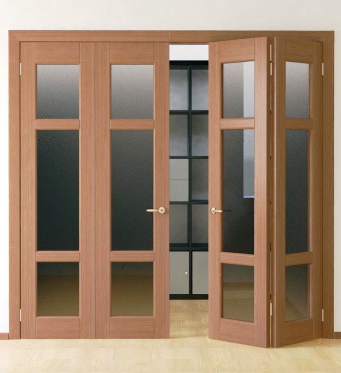 - различным количеством складывающихся секций в устройстве. На основе подобных систем производят не только интересные варианты перекрытия межкомнатных проёмов, но и перегородки для разделения пространства. Так, реально купить двери-книжки на заказ по своим размерам для обособления участка гардеробной, зонирования санузла, обустройства столовой;