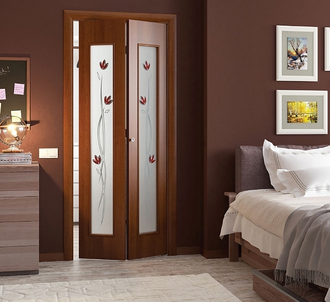 - из интересных материалов. В интернет-магазине можно купить двери-книжки, изготовленные не только из дерева. Большой популярностью пользуются зеркальные, стеклянные, алюминиевые модели. В оформлении двухкомпонентных створок задействуются ценные сорта шпона, эмали, ламинат;