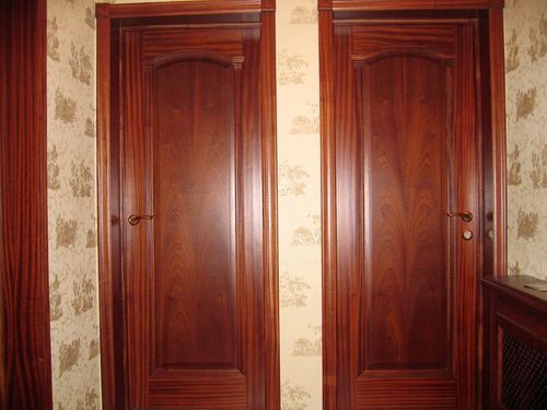 • дверь в шпоне вишни обладает интенсивным согревающим эффектом, что делает её незаменимым участником комфортабельного домашнего пространства. Светлые золотистые оттенки покрытия, кроме того, окутывают обстановку мягким светом, способствуют визуальному расширению помещения;