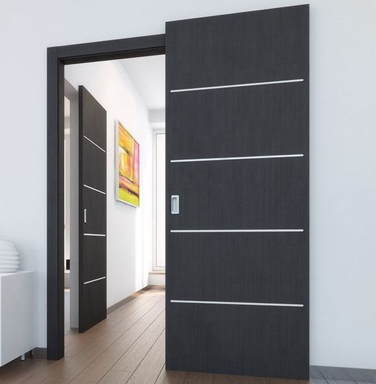 Изготавливаются раздвижные двери скрытого монтажа на основе стандартных полотен из ассортимента производителя. Они могут быть деревянными или стеклянными, заключать в устройстве вставки, собираться по щитовой или филёнчатой схеме, декорироваться шпоном или эмалью. Качественная «экипировка» и умелый монтаж любое решение превратят в часть инновационной системы.