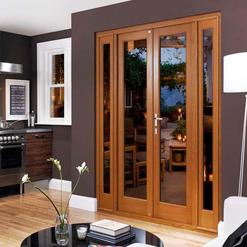 - наличие вставок. Модель бывает полностью глухой либо оснащённой стеклом, расположенным на одном или обоих полотнах. Решения с крупными вставками отвечают характеру гостевых и общественных помещений;