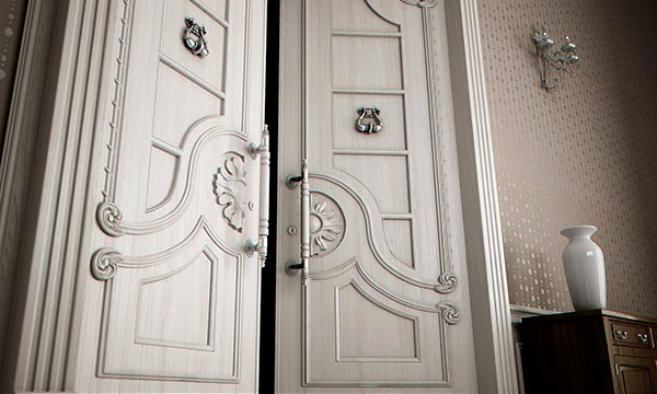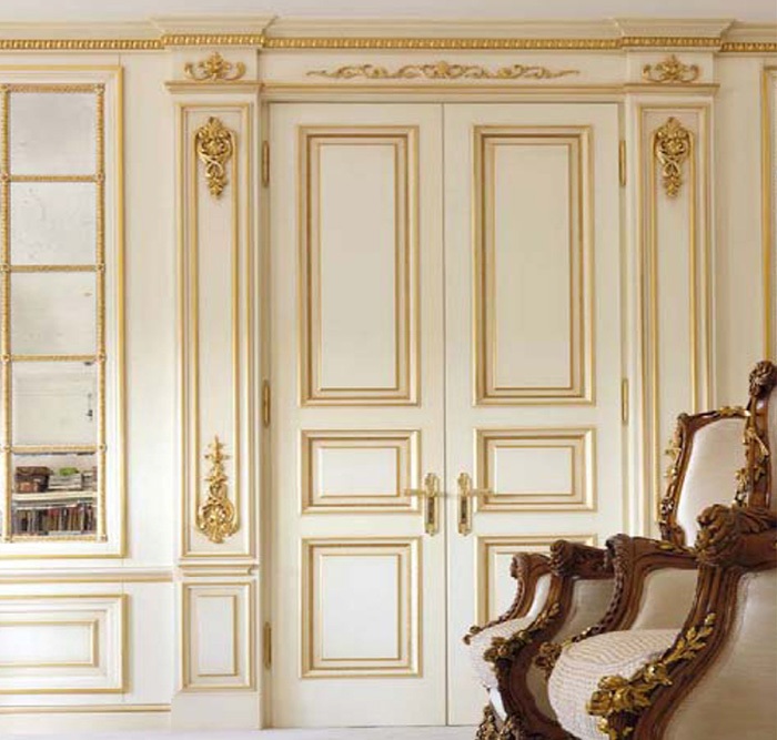 Оформление крупных моделей, устанавливаемых в масштабных, не испытывающих недостатка площади помещениях, может быть сколь угодно богатым и объёмным. Торжественный облик элитных двухстворчатых дверей в стиле классики формируют: