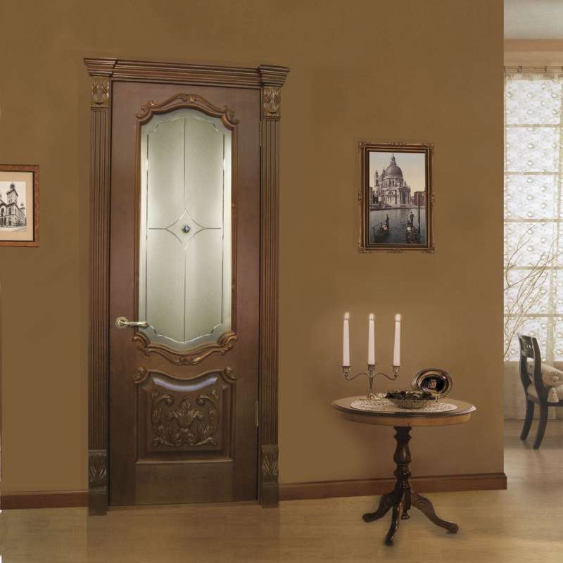 Художественные особенности шпонированной классической межкомнатной двери формирует целый набор приёмов, аксессуаров, эффектов. Такое изделие «любит» броский, объёмный, часто вычурный декор, представленный: