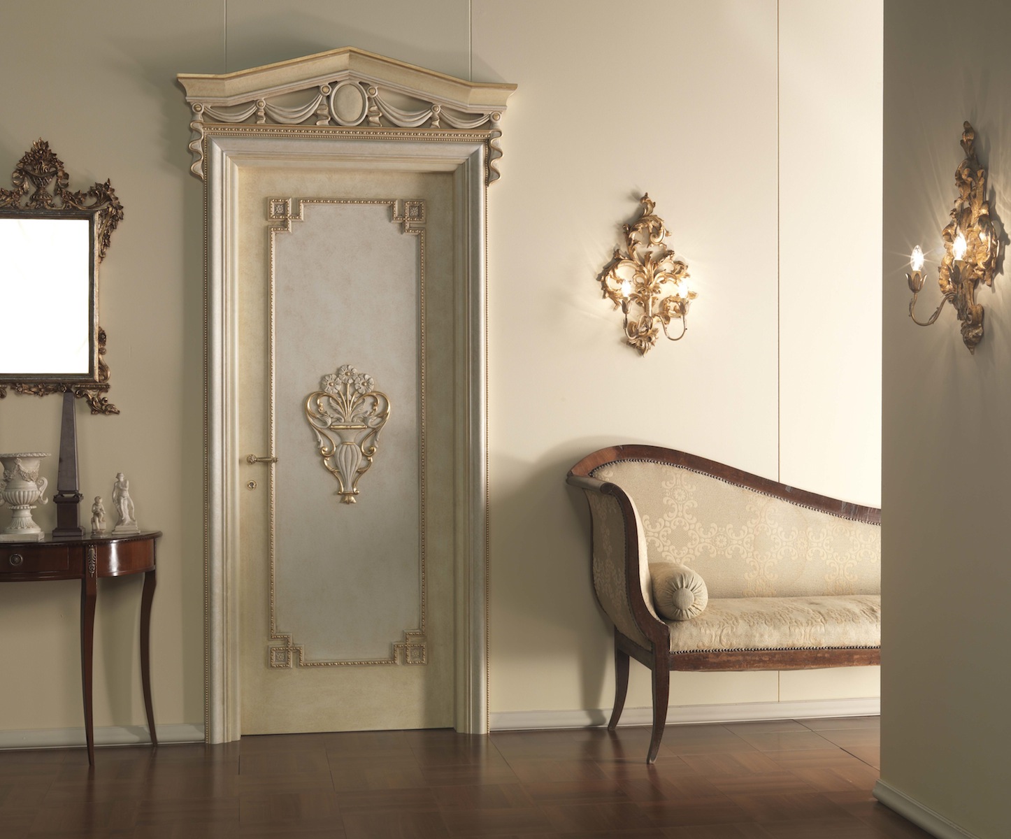 1. Brussel, Leon, Navarra. В самых нарядных интерьерах гармонично звучат изделия, выполненные в духе «дворцовой» классики. Филёнки сложных очертаний, массивные фигурные порталы, золото и патина формируют их великолепный облик. Купить такие красивые межкомнатные двери в квартиру стоит для просторной гостиной, черпающей вдохновение в роскоши ампира или барокко;