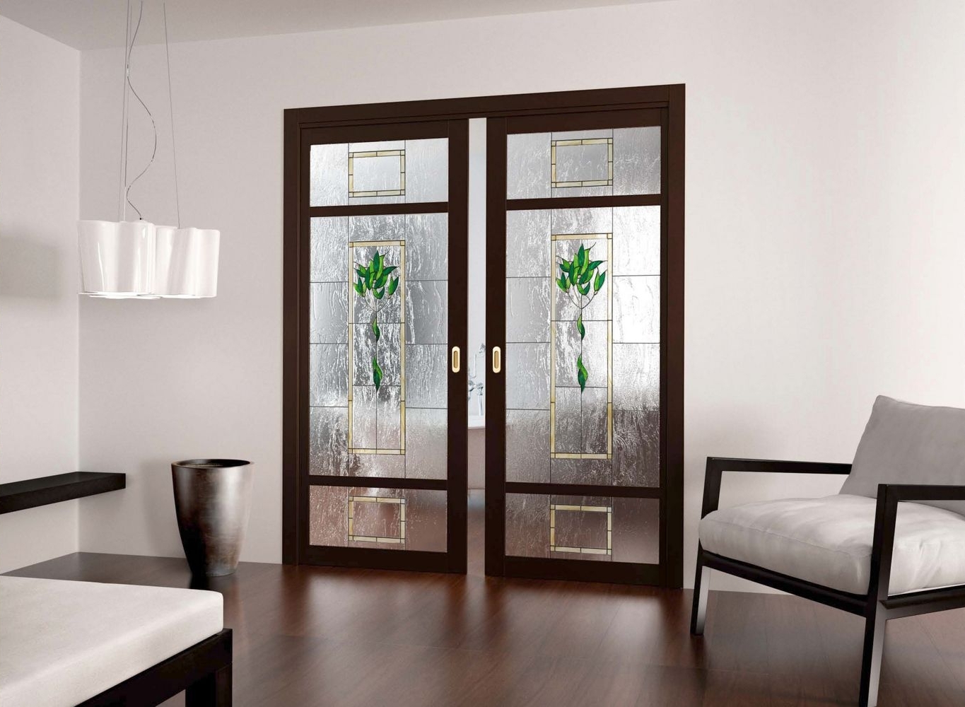 • стекло. Светопрозрачный материал используют в роли небольших и масштабных вставок, объединяют с каркасами из древесины или алюминия, применяют самостоятельно. Стеклянные полотна покоряют изяществом, воздушностью и многообразием вариантов дизайна. Их матируют, дополняют гравировками, витражами, ручной росписью и т. д.