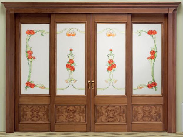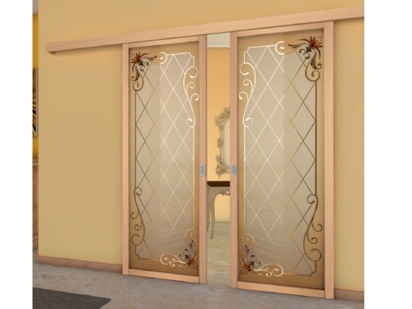 - стекло сверхстойких разновидностей. Самые красивые межкомнатные двери с универсальными дизайнерскими характеристиками получают из изящных светопрозрачных материалов. Словно сотканные из воздуха и света, они приносят с собой дух свободы, лёгкости, просторности. Стекло подлежит матированию, гравированию, фацетированию. Его украшают ручной росписью, витражами, фотопечатью;