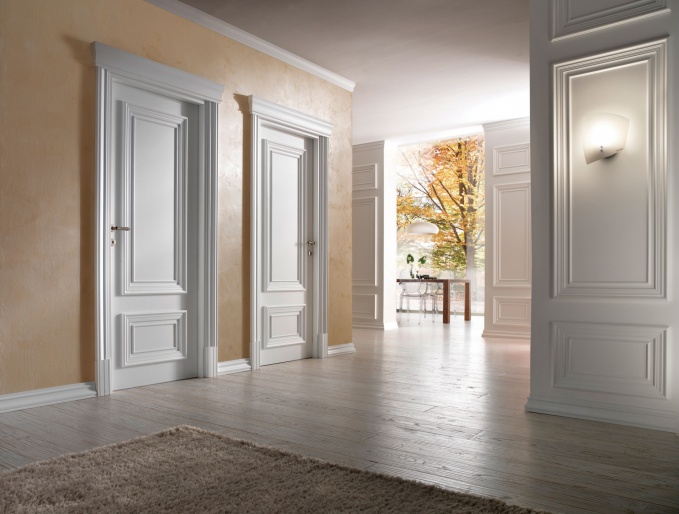 - Традиционные решения собираются по филёнчатой схеме, украшаются симметричными вставками, резьбой, позолотой. Широко применяются технологии искусственного старения - патина, морение, браширование. Проёмы, как правило, обрамлены порталами в стилистике античной архитектуры - величественными колоннами, карнизами, капителями. Оценить роскошь и очарование классики можно в коллекциях Navarra, Brussel, Leon торговой марки Academy.