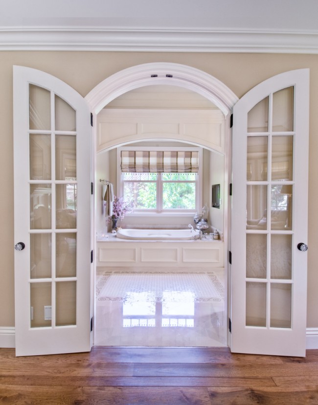 - на недостатки композиции, которые нуждаются в исправлении и вполне могут быть скорректированы посредством грамотно выбранной конструкции. Так, изделия светлых оттенков разделяют с окружением собственное сияние, разбавляя «мрак», царящий в помещении. Модели классических межкомнатных дверей, оснащённые рельсами, помогают экономить площадь;