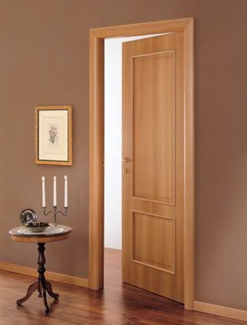 • из тонкого древесного среза, аккуратно покрывающего все элементы полотна. Зачастую недорогие межкомнатные двери из шпона оформляют по технологии файн-лайн, что на порядок уменьшает их цену. Такая облицовка изготавливается путём обработки и окрашивания из малоценных мягких пород. Данная методика делает доступными модели экзотических расцветок - красное дерево, эбен, палисандр, мербау. В натуральной отделке они по стоимости превосходят средние показатели.
