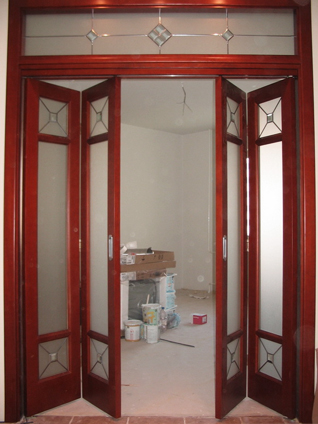 - из стекла, которое применяется в каркасе из дерева или алюминия. Светопрозрачные модели смотрятся изысканно и эксклюзивно и замечательно совпадают с настроением классических и современных интерьеров. Дизайнеры создают истинные произведения искусства, используя в декорировании стекла витражные элементы, художественную роспись, кристаллы, разного рода аппликации и т. д.