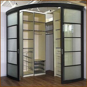 3. книжка или гармошка. Складная откатная дверь для гардеробной - ещё один пример удачного выбора. Такую модель реально установить даже тогда, когда гардероб оборудован в углу, когда рядом с ним нет свободной стены для парковки или имеются любые другие проблемы с монтажом обычных целых изделий. Полотно представляет собой набор из двух или нескольких сегментов, которые при сдвижении складываются и останавливаются у стойки коробки.