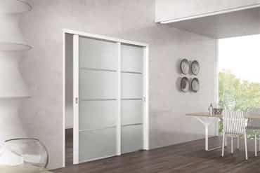 - сдвигающиеся в стену. В комплекте с такой системой поставляется металлический бокс - пенал, который встраивается в проём и зашивается гипсокартоном. Освобождая проход, створка сдвигается во внутреннюю парковку. Вся стена остаётся незанятой - мебель и технику можно располагать непосредственно рядом с ней;