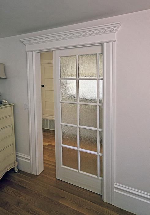 - для квартир и офисов, отдающих дань немногословности хай-тека и минимализма. В современных интерьерах используют гладкие полотна, натуральное происхождение которых подчёркнуто выразительной текстурой либо спрятано за эмалями броских оттенков, лаками с глянцевым эффектом. Подвесная деревянная дверь прекрасно звучит в сочетании с молдингами, вставками чёрного и белого стекла, зеркалами. Дабы акцентировать внимание на воздушности проёма, раздвижные системы нередко монтируют без обрамления.
