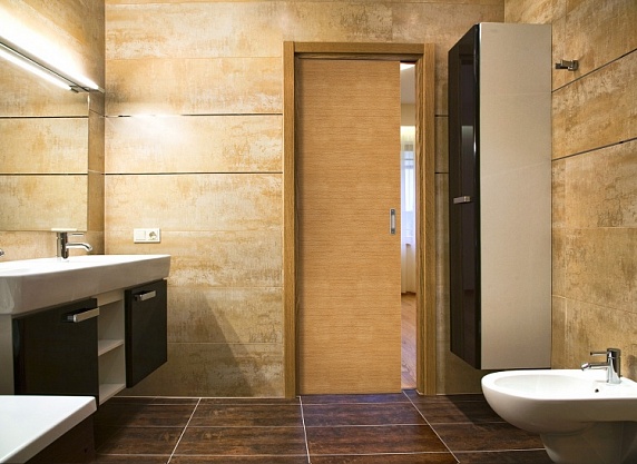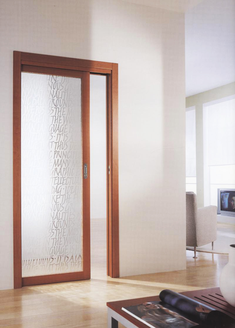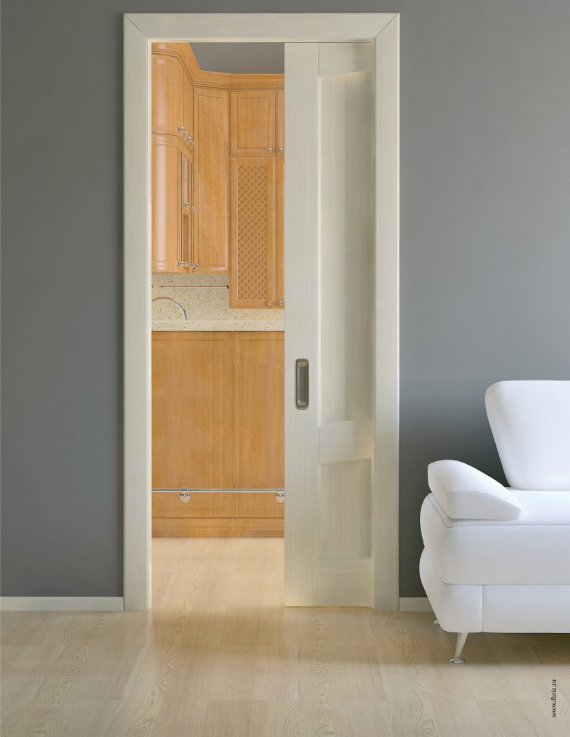 Наряду с полотнами на роликах, которые накладываются на проём и при открывании скользят вдоль примыкающей к нему плоскости стены, повсеместное распространение получили подвесные кассетные двери. Это встроенные конструкции, установку которых предваряет разбор стены и закрепление в ней металлической кассеты.