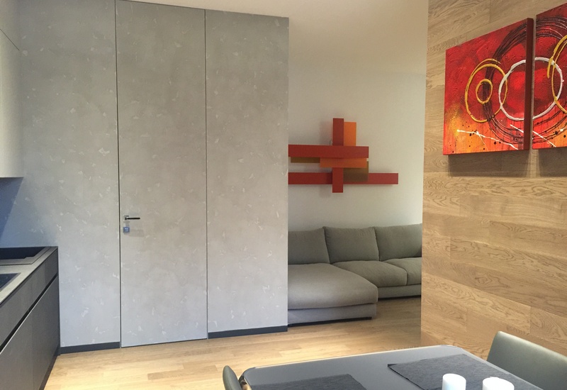 • системы скрытой установки. Конструкция такого типа представляет собой гладкую грунтованную створку, укомплектованную маскируемой рамой и внутренними петлями. Коробка позволяет закрепить полотно на одном уровне со стеной или спрятать его, оклеив обоями, покрасив или облицевав плиткой. Купить скрытую распашную дверь для кладовки - отличная идея, если служебную зону хочется сделать как можно менее заметной для посторонних глаз.