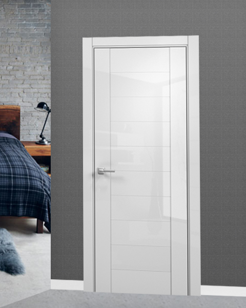 шикарный глянец, наделяющий отражающими характеристиками чёрную или белую распашную дверь в стиле модерн из серии Diamante;