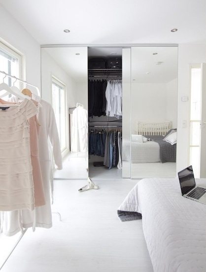 Союз роликового механизма и полотна с отражающими характеристиками - одно из самых эффективных оружий в борьбе за уютное, открытое, свободное помещение. Даже тогда, когда любое вмешательство рискует нарушить хрупкий баланс интерьера и возникает идея в принципе обойтись без створки, на помощь приходят раздвижные зеркальные двери.