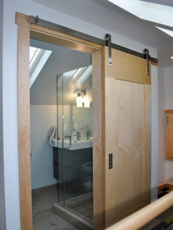 - в разделении совмещённых санузлов. Отгородить ванную от туалета с помощью полотна на роликах значительно проще, чем путём строительства новой стены. К тому же, откатная система сохранит первоначальные размеры пространства, отняв незначительный участок;
