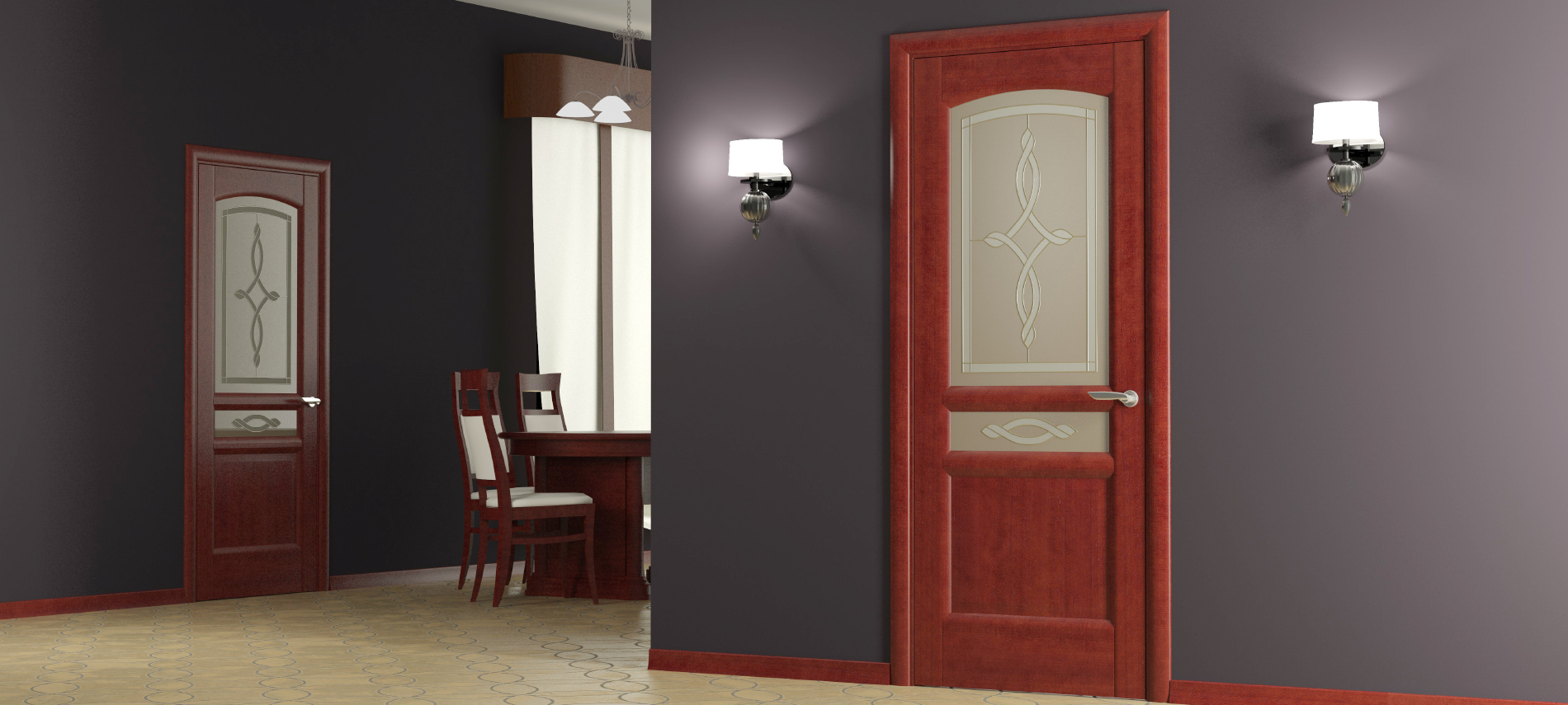Шпонированная дверь цвета красного дерева - яркий, экспрессивный, но требовательный элемент интерьера. Красновато-коричневый оттенок, насыщенность которого может варьироваться в зависимости от выбранной породы, превосходно смотрится лишь в «компании» нейтральных тонов, которые признают его первенство. Изысканные композиции создаются при участии: