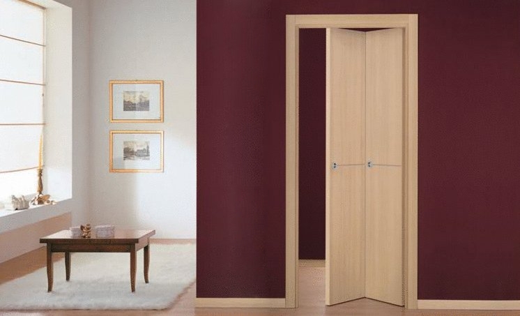 1. книжка. Полотно разделено на два сегмента в равных или неравных пропорциях. В открытом виде оно распределяет полученную после складывания ширину между смежными комнатами, таким образом, занимая минимальное пространство в каждой из них. Оснащённая уплотняющими контурами по периметру обеих секций, подобная конструкция отличается неплохими изолирующими способностями;