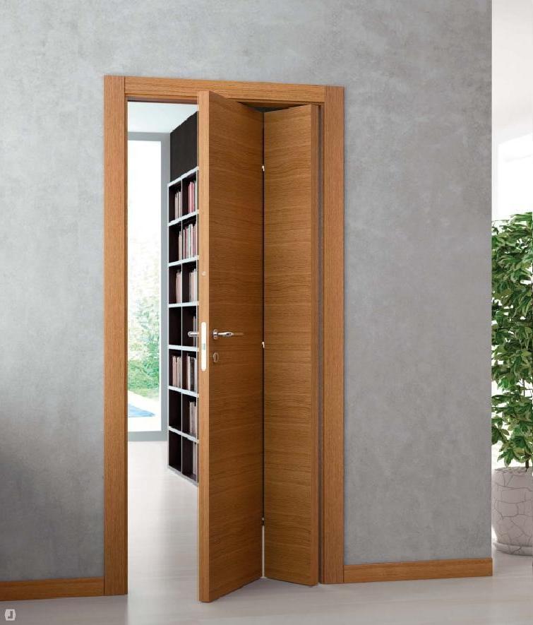 Специфика рассматриваемых инженерных разработок заключается главным образом в структуре полотна. Оно включает два компонента, одинаковых или неодинаковых по ширине, которые связаны друг с другом посредством специальных петель. Межкомнатная складная дверь-книжка эконом-класса изготавливается из МДФ. Можно заказать и более дорогие решения из массива, стекла, алюминия.