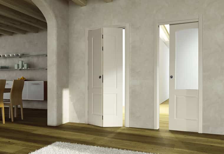 - книжки. К данной категории относятся межкомнатные двери, складывающиеся пополам, и асимметричные полотна, один сегмент которых вдвое шире другого. Продукция такого типа успешно заменяет обычные цельные конструкции в проёмах любых помещений. Она обладает неплохими изолирующими свойствами, надёжна, вынослива;