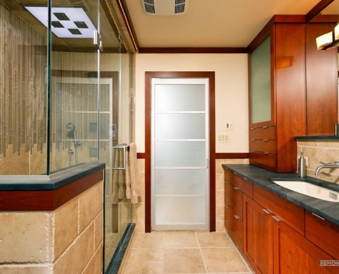 - дверь в ванную из матового стекла - это универсальное украшение, которое замечательно сочетается с любыми материалами, расцветками, направлениями дизайна;