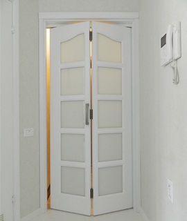 • рационально расходовать площадь. Складная система отличается высокой компактностью. Она уместна даже на границе двух тесных комнат, каждая из которых не может предложить достаточного пространства для поворота или сдвижения цельного полотна. Установка влагостойких дверей-книжек успешно осуществляется в узких проходах, углах, помещениях, обременённых многочисленной мебелью, и т. д.;