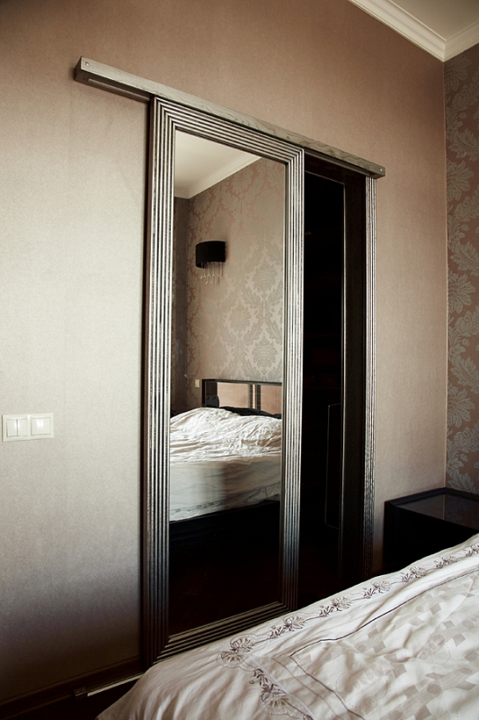 3. каркасные. И в стильное современное пространство, и в традиционный ансамбль вольётся модель, являющая собой сочетание деревянной или алюминиевой рамы и крупного зеркала. Профиль может обрамлять зеркало по периметру либо делить его на несколько блоков. Эффектно смотрится зеркальная межкомнатная дверь без наличников, устанавливаемая в замаскированную коробку и продлевающая плоскость стены;